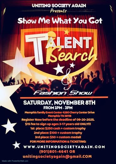 Currently, we are preparing for the 1st Annual Show Me What You Got Talent Search and Fashion Show  hosted by Memphis Family Event Center 4280 Cherry Center Drive in Memphis, TN, taking place on November 8th.